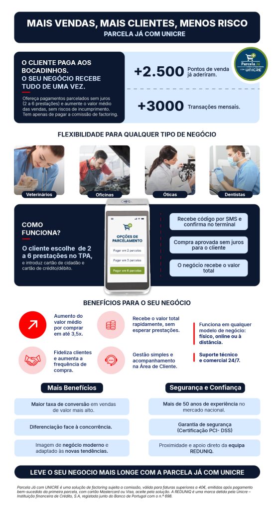 Instalment payments are transforming the market, offering more flexibility for consumers and more sales for businesses, as the infographic in this article shows. With Parcela Já with UNICRE, the customer pays in interest-free instalments and the business receives the full amount. This solution integrated into REDUNIQ terminals guarantees greater sales volume, more customers and less risk.